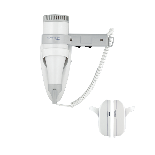 Asciugacapelli da parete con motore professionale, pulsante di sicurezza acceso/spento, tasto di regolazione 2 velocità – 3 temperature, cavo spiralato rinforzato, cavo di alimentazione scollegabile per eventuale collegamento diretto a cavo di rete che esce dal muro e interruttore di sicurezza per poterlo spegnere durante le operazioni di pulizia (I), presa rasoio bivoltaggio (RB), salvavita (D), 1400 o 1600 Watt.